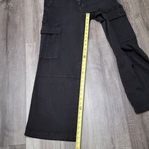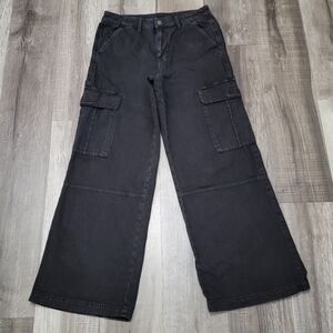 Stylish wide leg jeans. Features cargo pockets. Perfect for casual wear. High Rise. Faded black color. Jeans have stretch.