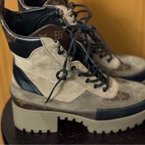 Chic lace-up boots with beige and black design. Perfect for versatile styling.