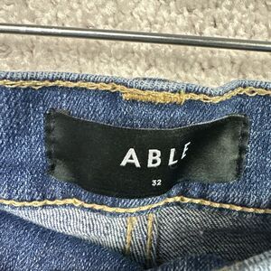 These are ABLE jean shorts in a size 32 with a mid-rise fit. The denim shorts feature a raw hem cut-off style in a solid blue color. They have a zip closure, flat front, and are made of a blend of Lyocell and Cotton. The shorts have button accents and are designed for casual wear, offering comfort for activities like walking. Made in Mexico, they have a medium fabric wash and are suitable for women's everyday wear.