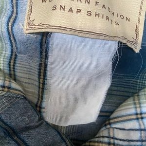 This shirt is in excellent preowned condition with no rips, stains or holes. The size/care tag is blank so please see measurements for fit. It has 2 breast pockets with double snaps and the colors are gray/black, white and a greenish yellow.