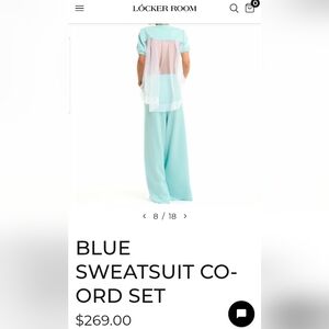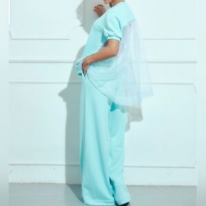Chic light blue top with a sheer back, and pants. Perfect for a trendy look. It's an elevated sweatsuit with unique features. Its Fabulous and can be worn with heels or kicks. A comfortable, stylish, and elevated casual look. I loved the on me shown.