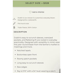 This is a new Frank & Eileen Dublin blazer in camel, constructed from triple fleece, 100% cotton material. It features a buttonless open front, notched lapels, and two roomy patch pockets on the front. The blazer has long, easy-to-scrunch sleeves and raw edges visible along the lapels, pockets, and hem. This is Overstock- label present but cut to prevent retail returns. F&E does not use retail tags.