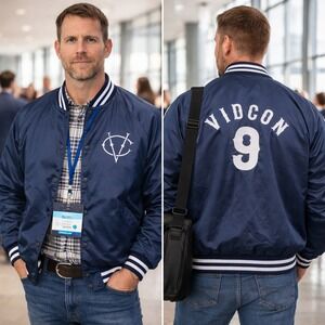 VidCon jacket, creator varsity jacket, satin bomber jacket blue, event exclusive jacket, embroidered varsity bomber, YouTube creator merch, streetwear bomber jacket, limited event apparel, collectors jacket