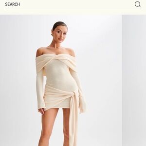 Chic off-shoulder dress with a wrap design. Soft cream hue.