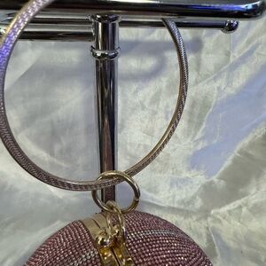 Pink Rhinestone-embellished spherical clutch bag, also referred to as a "disco bag" or "basketball clutch" due to its shape and sparkling appearance.