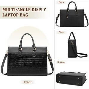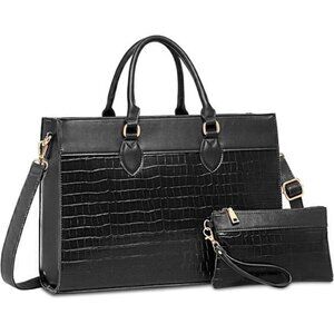 Women's Multifunctional Laptop BagThis laptop tote bag is versatile and can be used for a variety of occasions, whether you are going to the office, attending a meeting or traveling on business. It is also perfect for anniversaries, birthdays, Mother's Day, Valentine's Day and Christmas.Classic laptop bagThe women's laptop work bag is made of premium crocodile grain leather and polyester lining with water and scratch resistant benefits, adorned with contrasting antique gold hardware to convey a classic chic and stylish look and feel.Product SpecificationsColor: BlackSize: 16 x 5 x 11.8 inchesWeight: 2.5 lbsMaterial: Water-resistant leather and polyester fabric Water-resistant leather and polyester fabricFits most 13“/14”/15“/15.6” laptops.*STYLISH & CLASSIC LAPTOP BAG : Women's laptop work bag made of high quality crocodile pattern leather and polyester lining, it not only tear-resistant, but also waterproof and easy to clean, with gold-colored hardware to convey a classic chic and stylish look and feel. The metal feet base design protects your bag from damage.