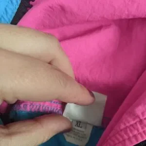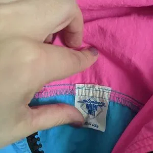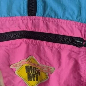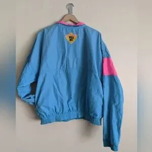 Crank up the '80s vibes with this bold vintage windbreaker in electric blue and bubblegum pink. This pullover beauty features a half-zip front, roomy kangaroo pouch with zipper, and the iconic “Slippery When Wet” patch on both the front and back—because subtlety is for people who don’t own windbreakers like this.