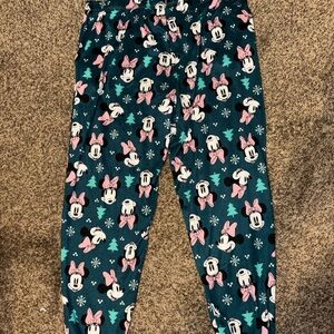 Cozy pajama pants with a playful Minnie Mouse pattern. Features a teal background with pink and white accents.
