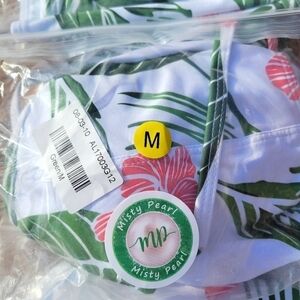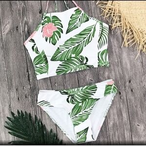 ▪︎White, Green, and Pink Flower & Greenery Print on a High Neck cut Bikini
