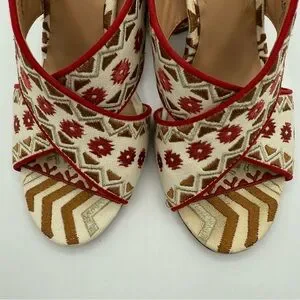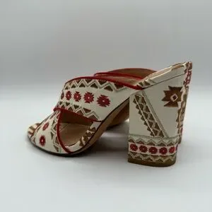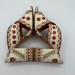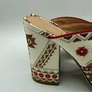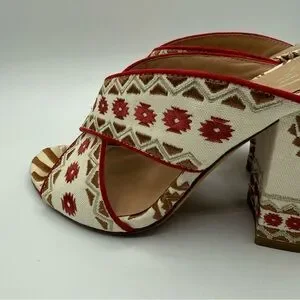 Add a unique, eye-catching touch to your outfit with these stunning bohemian-inspired heeled sandals. Designed with intricate tribal-style embroidery in warm tones of cream, red, and brown, these sandals are perfect for making a statement. The crisscross mule design offers an easy slip-on fit, while the sturdy block heel provides comfort and stability for all-day or night wear.