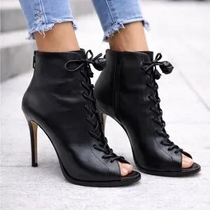 Turn heads with these sleek and sexy black lace-up ankle booties. Featuring a chic peep-toe design and a tall stiletto heel, these boots add instant edge to any outfit. The lace-up front gives a flattering, adjustable fit, while the back zipper allows for easy on and off. Perfect for nights out, date nights, or elevating a simple jeans-and-top look.