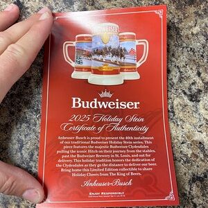 Classic Budweiser beer stein featuring iconic Clydesdale horses. Vibrant red and white design. Limited Edition “The Journey”.