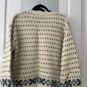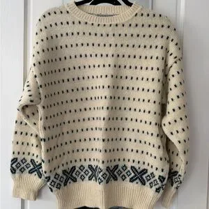 Warm wool blend sweater. Cream base with black pattern. Ideal for outdoor adventures.