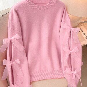 Elevate your style with this pink elegant French romantic knit pullover. Featuring a charming bow detail, this loose-fit sweater offers a comfortable and sophisticated look. With its round neck, long sleeve and drop shoulder design, it adds a touch of romance to any wardrobe. The regular hem and classic length make it easy to pair with jeans or skirts for a versatile everyday outfit.