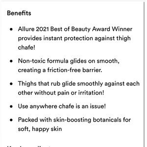 Thigh Rescue: Protect against chate once and for all with this non-toxic anti-friction stick. The balm-like formula creates a barrier that sits on top of skin, allowing thighs that rub to glide smoothly against each other. New, sealed.