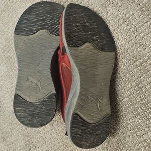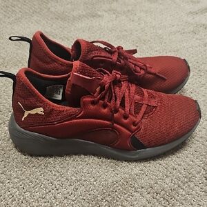 Vibrant red sneakers with a sleek gold logo. Perfect for active wear.