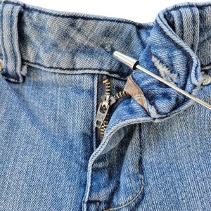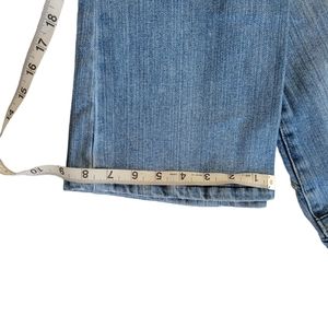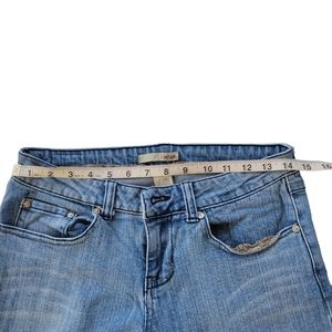 Style: Boot cut, light wash denim, embordered back pockets. fabric detail on inside waist and front pockets