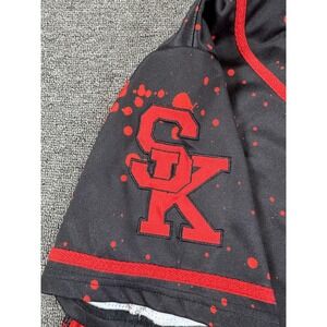 Details: V-neckline with full button front, contrast red piping, KING logo patch on chest, SK applique on one sleeve, winged creature graphic on the other sleeve, and large red winged figure graphic on the back over an allover red splatter pattern.