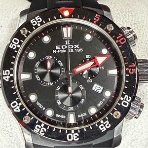Edox Chrono Offshore 1 Sharkman ll North Pole Limited Edition Men’s Watch. 47mm Quartz 42.19510221 Black/Silvered Uni-directional Rotating Bezel, Scratch Resistance Sapphire Crystal, Black Dial, Stainlessss Steel Case Butterfly Clasp & Silicone Strap.