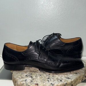 Magnanni Sergio Wingtip Oxford Dress Shoes Black Calfskin Leather 13974. Men’s Size 10. Great pre-owned condition! There is wear on soles please see photos. Elevate your formal attire with these sleek Sergio Wingtip Oxford Dress Shoes by Magnanni. Crafted in Spain with premium black calfskin leather, these shoes feature a stylish wingtip design that adds a touch of sophistication to your look. The size 10 shoes have a medium width and are perfect for men who appreciate the finer things in life. These dress shoes have a convenient lace-up closure for a secure fit. The leather upper and lining offer a comfortable feel, while the durable sole ensures long-lasting wear. With their timeless style and superior quality, these Magnanni Sergio Wingtip Oxford Dress Shoes are a must-have for any formal occasion. Elevate your style with these classic black leather dress shoes. Perfect for any formal occasion.