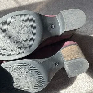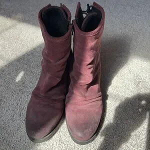 Step out in style with these chic suede ankle boots. Featuring a rich distressedburgundy color, these boots are perfect for any occasion. The comfortable block heel adds height without compromising comfort. Ideal for pairing with your favorite outfits. Approximately 3” heel. Very comfortable!