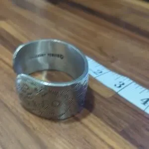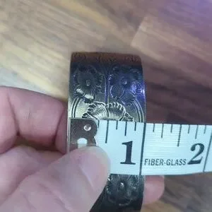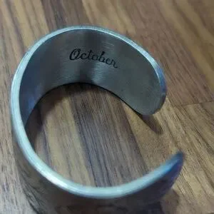 Beautiful wide cuff bracelet from Salisbury pewter celebrates the month of October with beautiful cosmos flowers. Silver in color.