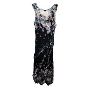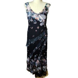 Komarov floral print chiffon overlay maxi dress in size XL. This elegant piece features a flattering V-neckline and sleeveless design, with delicate ruffles cascading down the side of the skirt for added movement and texture. The sheer chiffon overlay showcases a beautiful floral pattern, offering a sophisticated and ethereal aesthetic. Perfect for a garden party, a formal evening event, or a destination wedding.