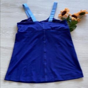 Patagonia Front Side Tank In Blue Butterfly. Features a soft a poly/spandex knit fabric, non-binding supportive straps, supportive moisture-wicking mesh shelf bra, sweetheart neckline, longer length hits at the hip hip and is semi -form fitting