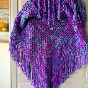 -Handmade crocheted poncho in a vibrant multicolor blend of purple, blue, and hints of pink