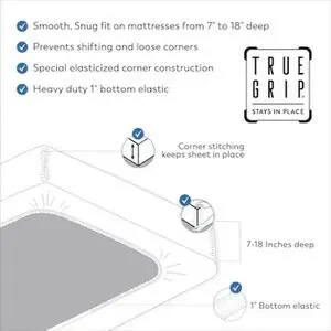 Patented True Grip fitted sheet fits mattresses upto 18 inch and provide snug fit