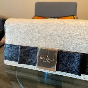 Chic Kate Spade wristlet with a cream body and black accents. Features a stylish bow detail. Ideal for elevating any outfit.