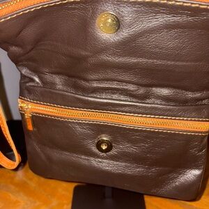 Vera Pelle brown leather clutch with striking tan details. Features tassel accents and wristlet strap.