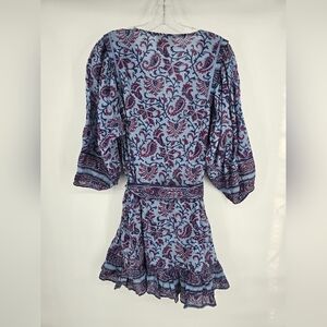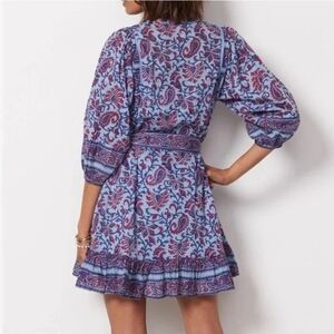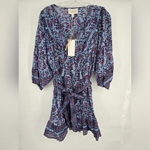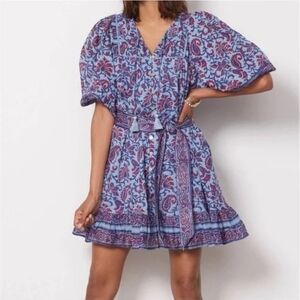 NWT! Cleobella, CadeTie Belt Mini Ruffle Dress, Blue/Wine Delhi Print, Size Large