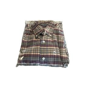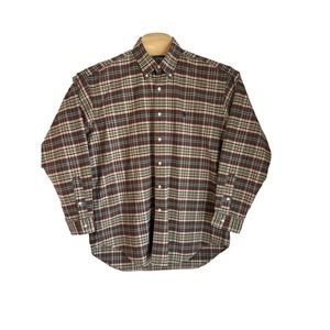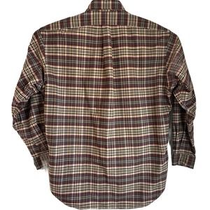 The shirt is made of heavier cotton fabric with a knit texture, making it a vintage piece that is not only stylish but also durable. The brown color adds a touch of warmth to any outfit, while the colorful plaid pattern makes it stand out. The shirt has been well taken care of, and it is recommended to dry clean only. This shirt is perfect for any man who wants to add a touch of classic and preppy style to their wardrobe.