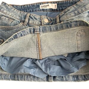 Trendy light blue denim mini skirt. Features side pockets and shorts underneath. Has only been worn once. There is a bit of stretch.