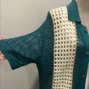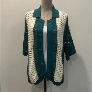 Urban Outfitters Unisex Teal & Cream Crochet Cardigan Size Medium Retro Style