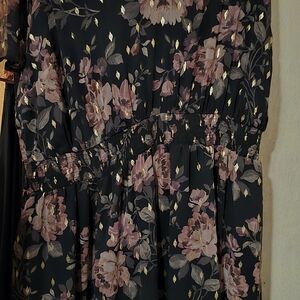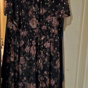 Elegant maxi dress with a floral pattern. Features a black base with purple flowers. Perfect for any occasion.