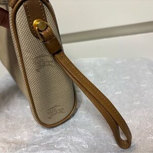 Small clutch bag with a brown leather strap and a zipper closure. The bag features a Burberrys logo.