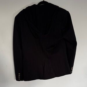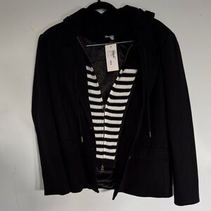 Elegant black blazer with a stylish striped inner layer. Ideal for versatile styling.