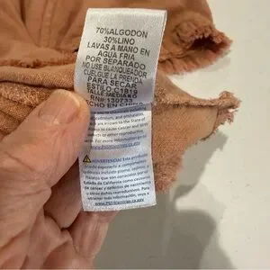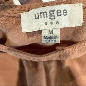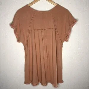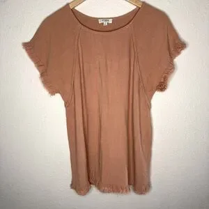 Umgee Linen Blend Top Short Sleeve Pintuck Fringe Hems Peachy Tan Women’s Size M