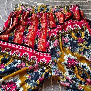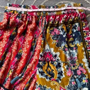 Chic floral joggers with vibrant multicolor patterns. Comfortable fit with an elastic waistband. Tie at waist with tassels. Side pockets. Cinching a leg bottom creating a tapered look.