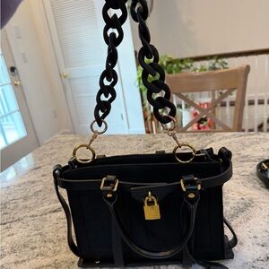 Black Calf Leather Encasement with Gold Hardware, long black calf leather adjustable strap, matte black chain shoulder strap, black felt organizer insert.