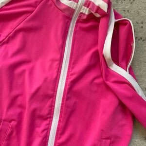 Stylish pink and white track suit with striped details. Perfect for casual wear. Jacket has cold shoulders & pants have zippers @ bottom of legs.