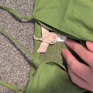 This beautiful linen blend midi dress is an absolute show stopper! New with tags. Stretchy back allows for a bit of accomodations and the ties are adjustable as well as the straps. Sadly never wore it as the event was cancelled 😕 Looking to find her a new home. Fits true to a size medium.