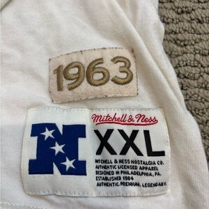 White Mitchel and Ness San Francisco 49ers throwback tee/jersey featuring embroidery and patch details. Gold '1963' embroidery adds a vintage touch. Mitchell & Ness branding included. Size XXL. Reinforced elbow patches. Vintage throwback style. Some yellowing on collar.