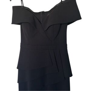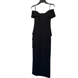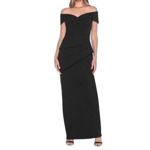 Xscape Jovie Peplum Dress Off Shoulder Black Scuba Crepe Excellent $259. Size 4