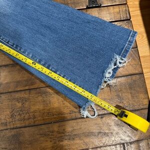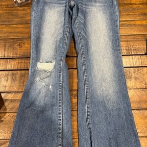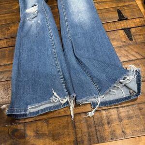 I have here this beautiful comfortable stretch high rise flare medium blue wash distressed denim jeans. This pair of jeans is by Flying Monkey from Buckle and is a size 26.