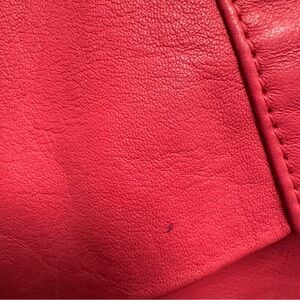This awesome soft leather moto jacket is in excellent pre-owned condition. There are a couple of teeny tiny knicks though. It’s a perfect shade of pink to be cool but not overly austentatious. It zips at an angle in the front and there are four little zipper pockets as well. The jacket is completely lined.