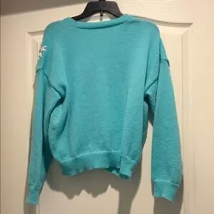Elevate your wardrobe with this chic turquoise cardigan, adorned with charming floral embellishments. Perfect for adding a touch of elegance to any outfit.
