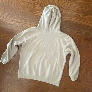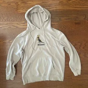 Hoodie from Jean-Michel Basquiat! Thick and soft sweatshirt material in a neutral beige. Hooded, long sleeve, and with kangaroo pocket in front. Dinosaur screenprint on front chest with Basquiat embroidered in black. No rips, stains, or tears. No cosmetic damage.